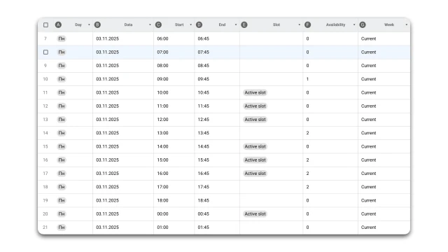The Outlook calendar is linked to a database inside the constructor – a table with dates for two weeks and ready slots for each hour. You only need to specify the active slots in the table and the bot itself will synchronize Outlook with this data. The date table is updated automatically.