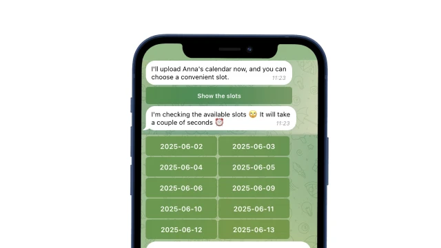 This is a basic bot script that can be adapted to your processes and supplemented with useful functions: automatic meeting reminders, flexible postponement or cancellation, collecting information before recording, payments, feedback after meetings, integration with CRM, etc.