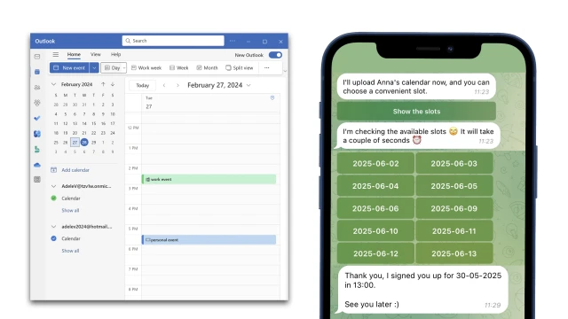 Manually coordinating meetings is long, inconvenient, and often leads to errors and overlaps. A chatbot with integration of Exchange and Outlook helps to create a convenient and effective service for scheduling meetings: checks the schedule → shows available slots → sets the meeting on Outlook.