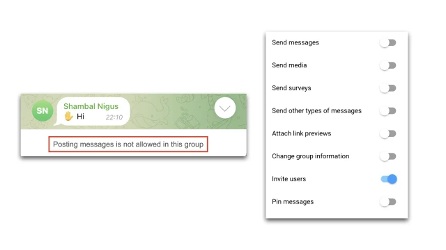 In addition to sending messages, you can also prohibit other actions: inviting participants, sending media, etc.