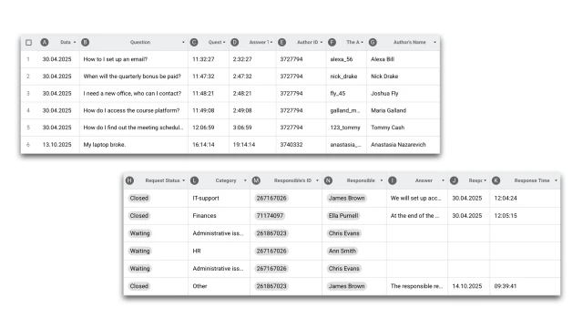In companies, employees' questions often end up in personal chats, get lost, or go unanswered. The chatbot will help streamline communication with employees: it accepts requests in one place, immediately sends them to the right specialist and saves them in a table. This helps you avoid missing any requests, speeds up responses, and makes internal support more transparent and manageable. At the same time, the bot works equally well for 10, 100 or 1000 employees.