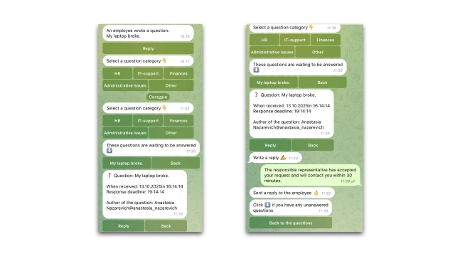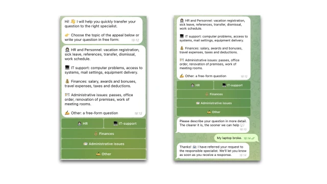 An employee launches the bot on Telegram and selects a question category (for example, IT support) or writes in free form. We recommend enabling ChatGPT so that the bot determines the subject of the request itself.