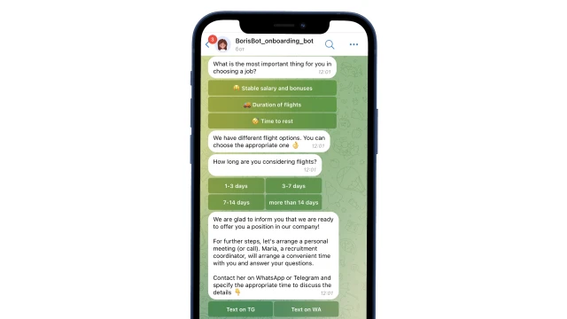 In the messenger, the bot personalizes the offer for each candidate. It clarifies what is more important to them: a stable salary, proximity to home or career growth — and talks about the vacancy with this in mind. Then it makes an offer and suggests to do a test assignment, send documents, sign up for an interview or write to you in a messenger to discuss the details.
