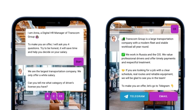 If the candidate has passed the selection process, it suggests switching to a messenger (Telegram, WhatsApp). This way you receive the contact of the applicant and are be able to interact with him, for example, to send warming messages. At this stage, it is also important to present the company – to show a short, engaging video about you.
