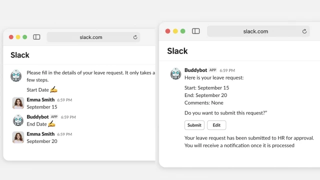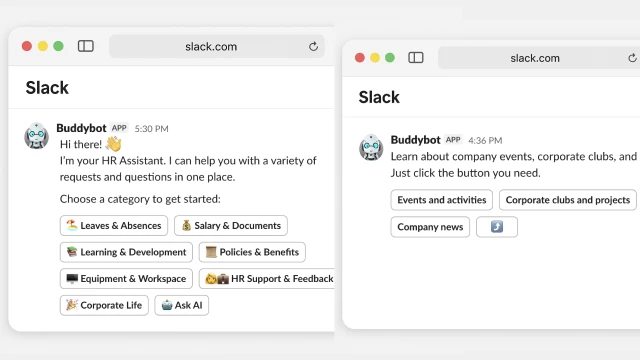 The bot helps employees submit requests, find answers to questions, and access other HR services directly in Slack
