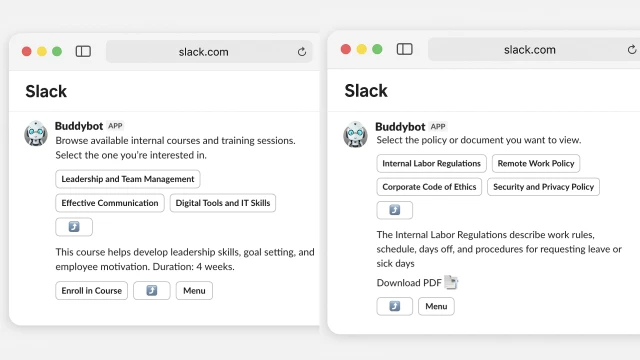 In this way, the bot turns Slack into a single “window” for all HR processes: employees quickly get answers, submit requests, and save time, while HR reduces the workload of routine queries and can focus on more strategic tasks.